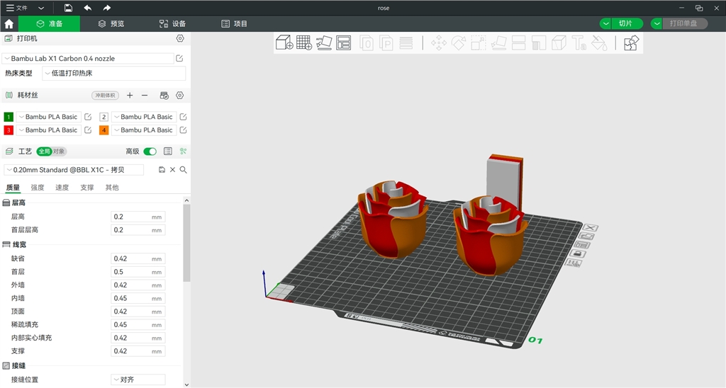 首先將玫瑰花的STL檔案放入Bambu Studio裡,由於不需要任何支撐,不太會操作軟體也能印喔!Bambu Lab X1 Carbon Combo一次可以四色列印,可以挑自己喜歡的顏色去印,創造屬於個人特色的玫瑰花喔!