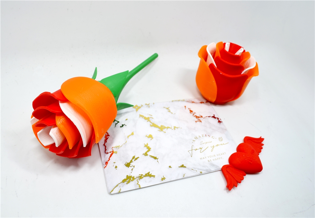 本次列印玫瑰花與花莖整體大約花14小時左右,玫瑰花尺寸約80 mm x71mm x 74mm,花莖約尺寸約62 mm x 62 mm x 140 mm。Bambu Lab X1 Carbon Combo列印速度可達500 mm/s,不需要耗費太多時間等待!只要再放上一張飽含心意與感謝的卡片送給另外一半,簡單卻又獨特!三帝瑪(3DMart)陪您一起度過浪漫的情人節!