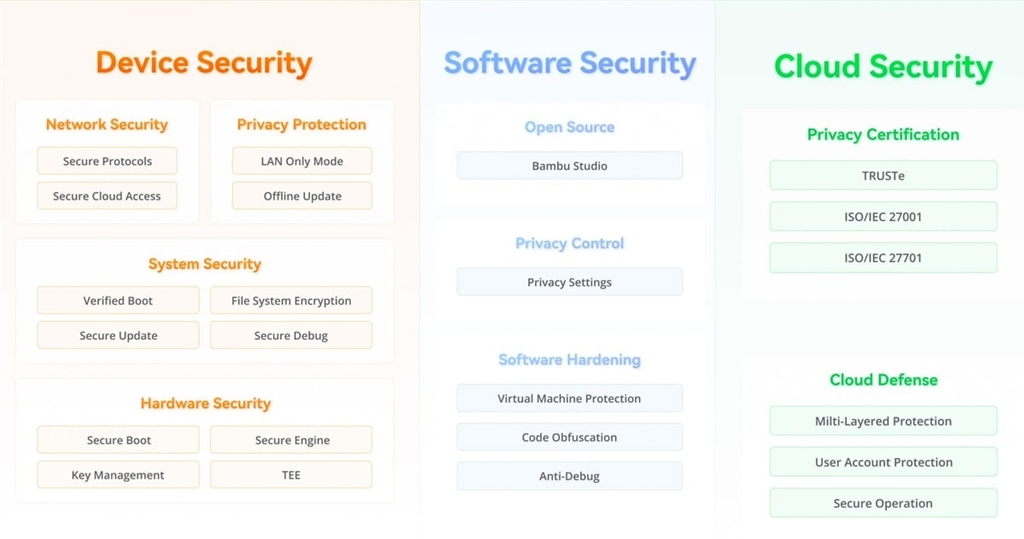 安全啟動和驗證啟動:所有 Bambu Lab 印表機均支援安全啟動功能,該功能使用硬體「信任根」從印表機開機的那一刻起,逐一驗證印表機軟體的真實性。