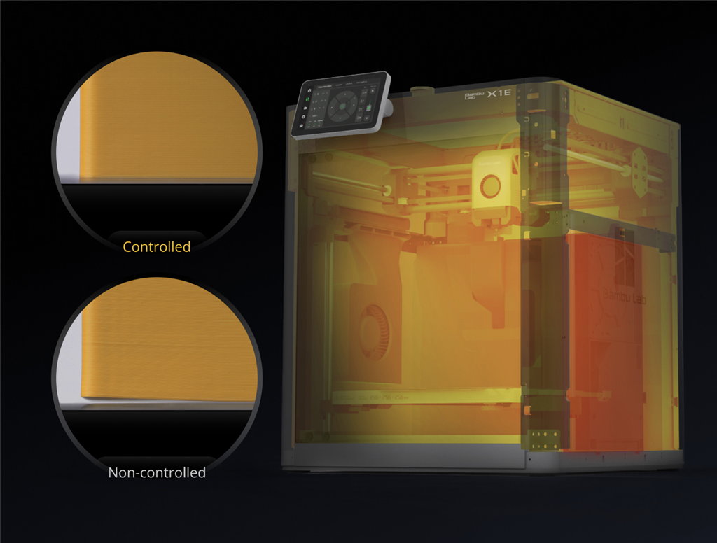 X1E能改善的3D列印質量。事實上,X1E提供主動的3D列印室加熱和溫度調節(jié),減少翹曲並改善層間黏合。X1E能夠主動控制3D列印室的溫度,最高可達60℃或140℉。據(jù)稱,這可以提高3D列印的質量,尤其是在使用容易翹曲的材料時,如ABS和PC時。