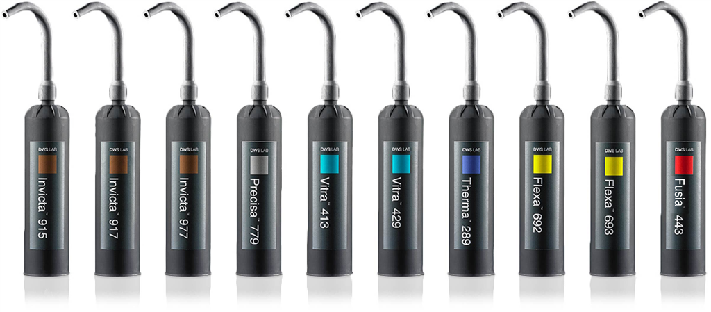 DWS具有多種類的專利光固化3D列印材料:丙烯酸樹脂、ABS類、聚丙烯類、剛性不透明材、透明材、橡膠類、奈米陶瓷及用於鑄造之臘材。