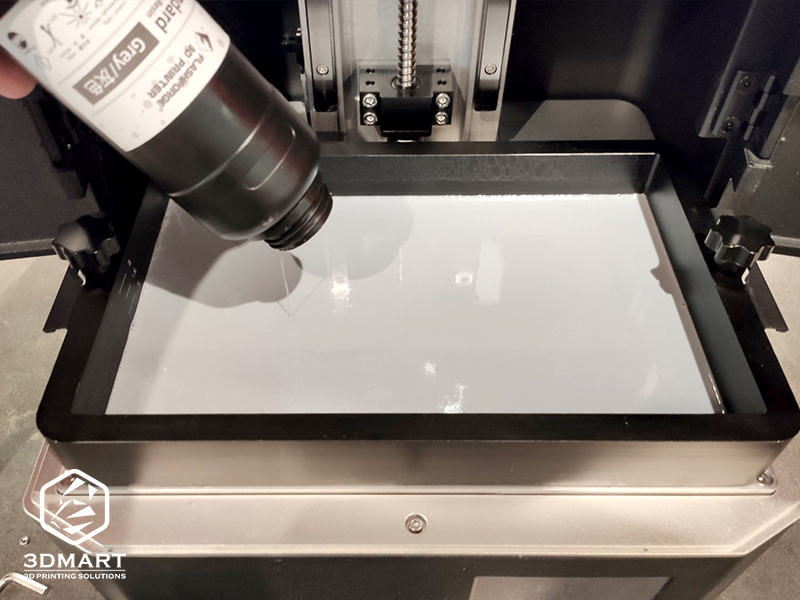 接下來,搖晃光敏樹脂並倒入樹脂槽,樹脂量可依照樹脂槽內(nèi)的標記線為主,最後將3D列印機的遮蔽光門關上。