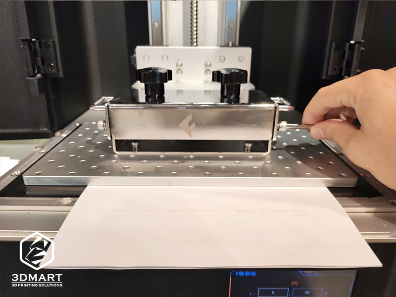 完全貼平底部紙張、LCD面板後,將載臺的固定螺絲重新鎖緊,來回抽動三張紙,以能夠抽動,但有一些阻力為標準,最後點擊螢幕上的「最高」,平臺會再次上升至頂部,完成Z軸校正。