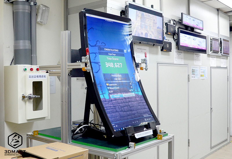 (研華科技進行遊戲測試中的大型曲面觸控式屏幕。)