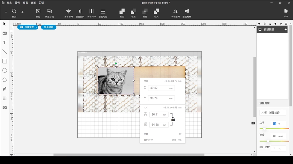 雷射雕刻前使用FLUX專用的編輯軟體Beam Studio,匯入物件後可以調整大小、設定座標、旋轉、對齊…等多功能,「雷射設定」中也能依照需求選擇開啟漸層模式、設定曝光數值。