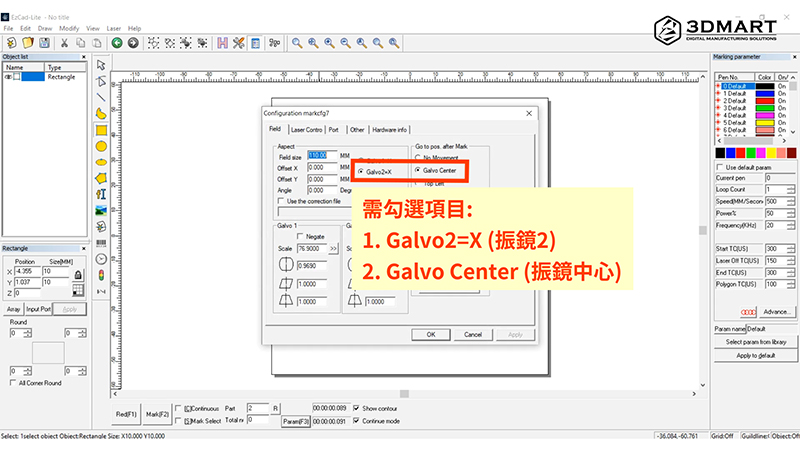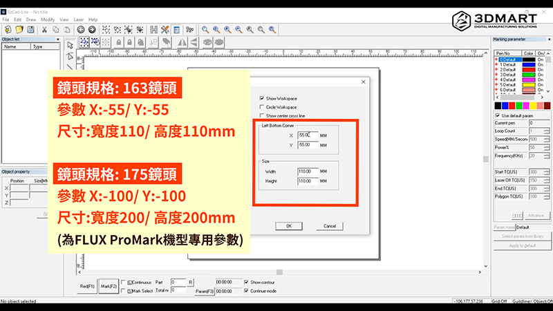 開啟FLUX ProMark專用軟體,依據(jù)使用的鏡頭規(guī)格(163或175鏡頭)進行參數(shù)設定,使用不同的雷射鏡頭,數(shù)據(jù)設定也會有所不同。