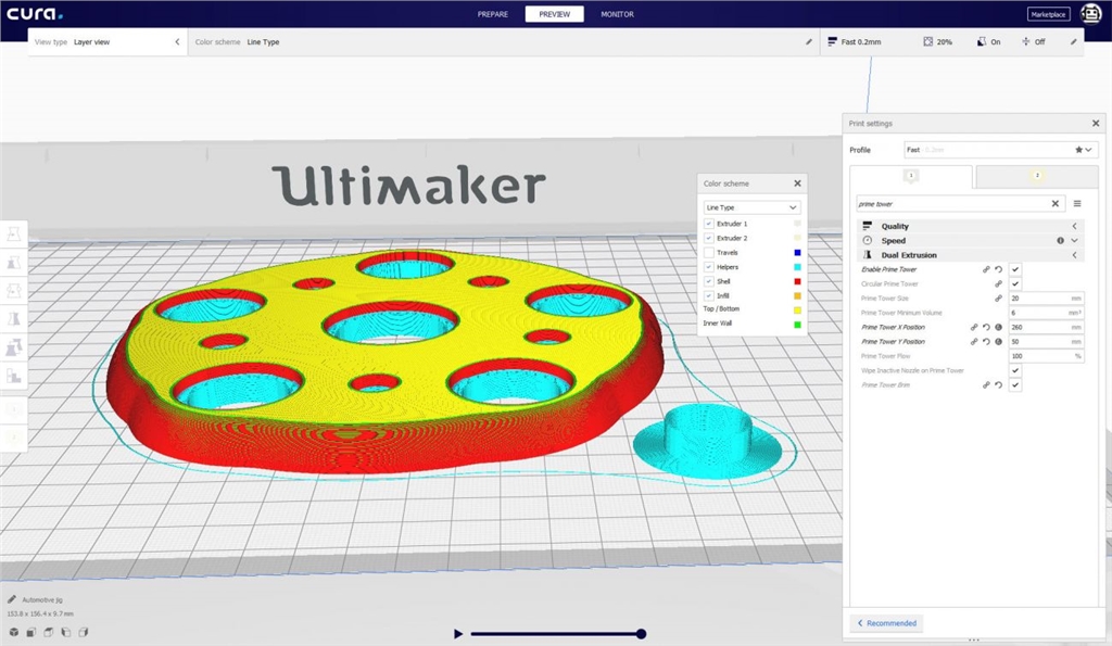 使用雙噴頭列印時,換料塔能有效防止兩種材料相互混和,讓成品更美觀;在新版Cura 4.1中,你可以在換料塔上使用「邊緣」(Brim)──即使你的物件沒有使用「附著」功能,透過增加附著力能讓換料塔將在整個列印過程更穩(wěn)固。
