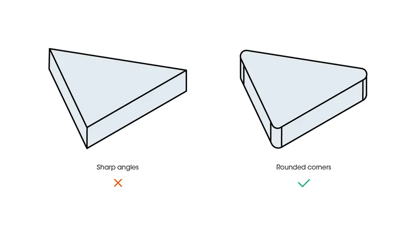 熱成型並不適用於具有銳利角(小於90°)的模板。除了最小的傾斜角度,銳利的垂直角更容易導致塑膠片在成型過程中出現網狀撕裂。為了避免這種情況並提高部分質量,請確保模板的所有角落和邊緣都是圓的。