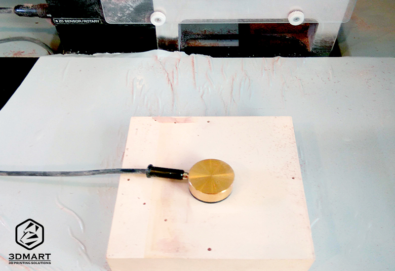 平臺上方需先放置一塊墊底的角料,並將圓形的金屬校準工具約略放在角料的上方中心點,機器會透過這個校準工具進行定位,接著才放上欲切削的原料塊並同樣再次做中心點定位。