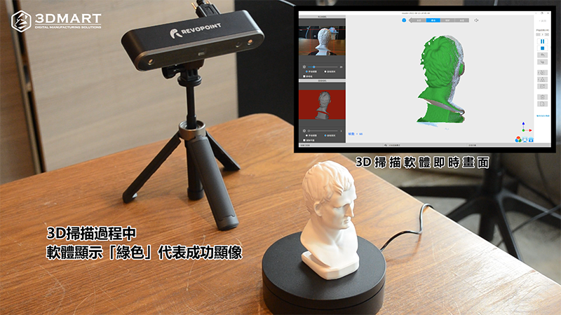 使用腳架固定掃描器,搭配轉(zhuǎn)盤進(jìn)行3D掃描,開始掃描之前系統(tǒng)將自動(dòng)即時(shí)偵測,並且會(huì)提示物件擺放的最佳位置。