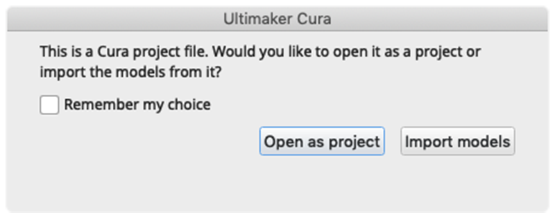 開啟檔案項目時,Ultimaker Cura提供置入整個項目文件,或置入其中一個模型的選項。