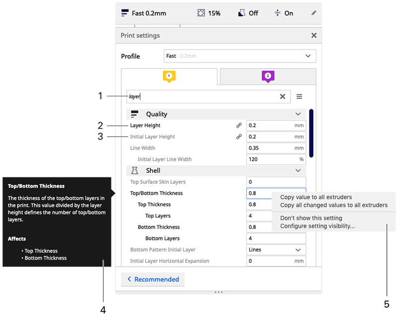 Ultimaker Cura的設定面板中有推薦與自訂模式,推薦模式適用於初學者,而自訂模式能為有經驗的用戶提供更多的設定。