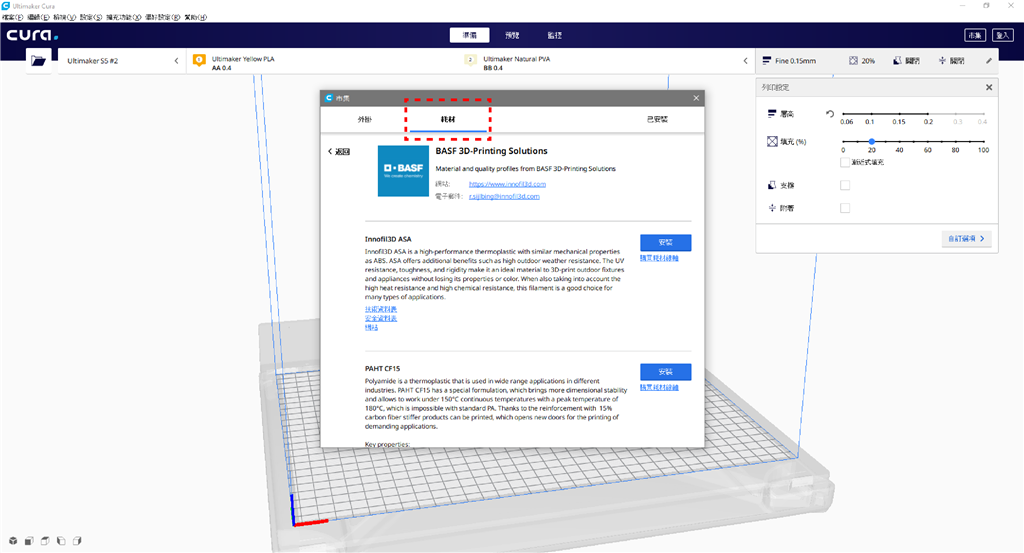 (在「市集」的「耗材」選單中可以看到各式新增的材料聯盟廠商及其提供的線材資料,並可以免費在此下載Ultimaker專用的官方列印參數)