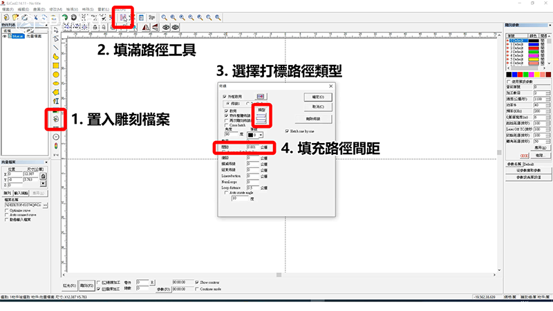 將要進行雷射打標的物件檔案置入,並依照需求編輯、修改尺位置及設定數據。