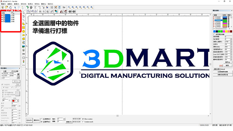 為了避免設定時錯亂,可以自行將「圖層顏色」設定成「預計打標顏色」,最後全選圖層中的物件,準備進行打標。(注意:下圖中物件顏色僅為「圖層顏色」,打標顏色不同取決於參數設定)