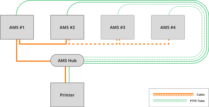 打印機的內置緩衝只能連接到 1 個 AMS。更換為 AMS Hub 後,打印機將能夠連接多達 4 個 AMS。