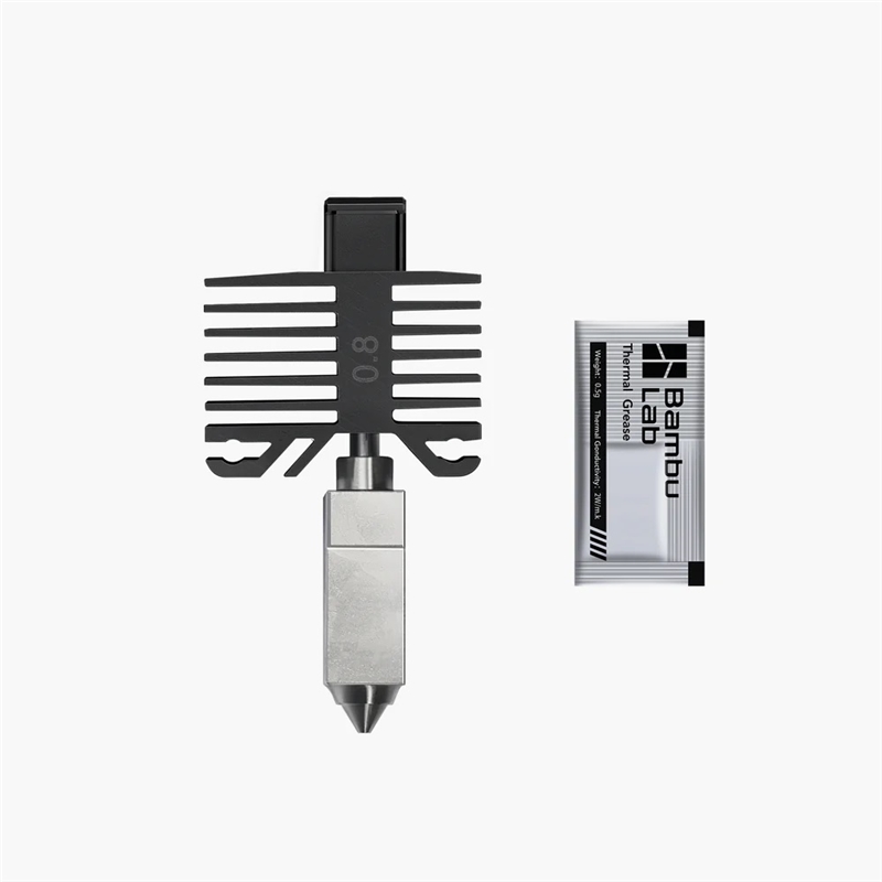 帶不鏽鋼噴嘴的熱端組件採用的一體成形設(shè)計。僅適用於Bambu Lab 3D列印機。噴嘴集成到模組中,並透過細(xì)金屬連接到散熱器,已獲得最佳性能。有了這種設(shè)計,模組的加熱速度會比普通的模組快得多,而且一體成形設(shè)計有效地減少更換噴嘴可能的問題。散熱片採用高導(dǎo)熱鋁合金,喉部採用TC4鈦合金。噴嘴由銅合金和不鏽鋼組合製成,在保證硬度的同時可大流量列印。