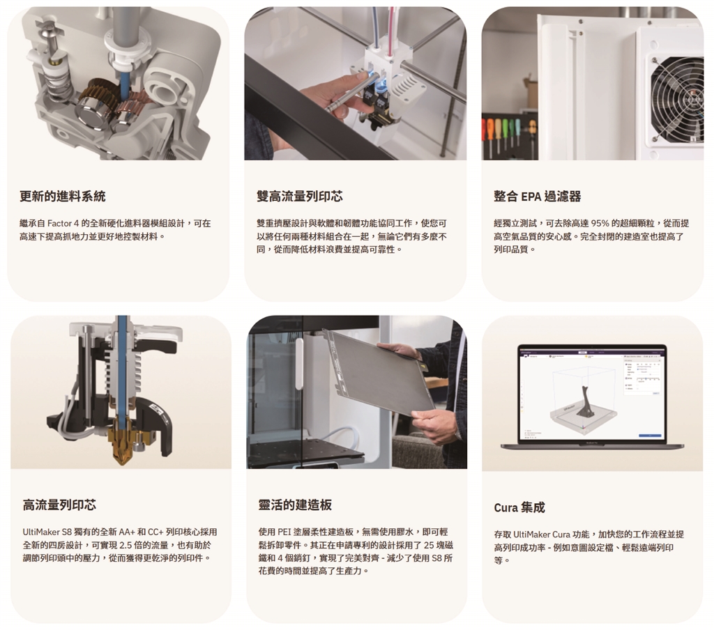 S8 生產效率是前代產品的 4 倍,同時列印品質也提高到 0.15 毫米 ± 0.15%。