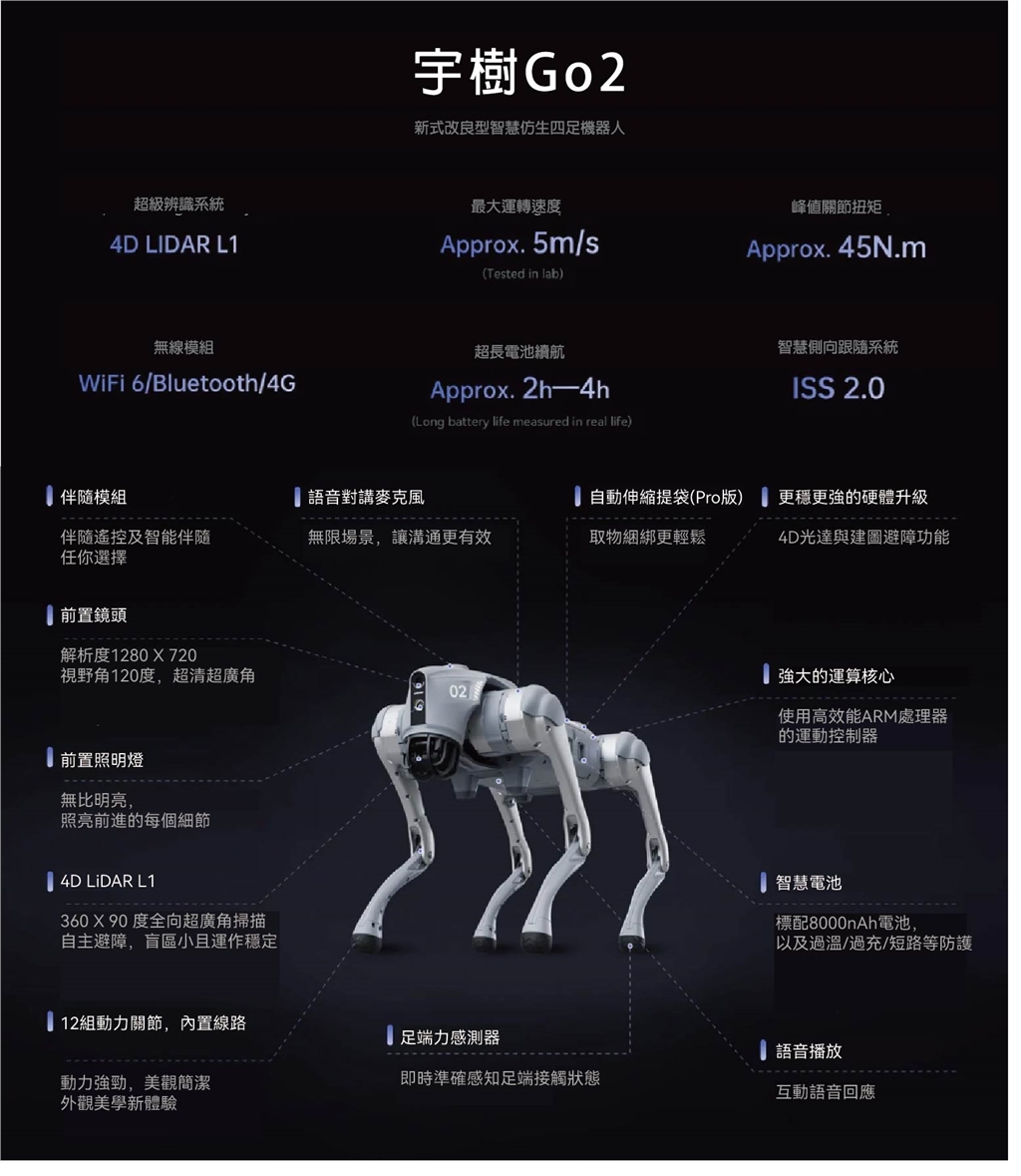 品項 宇樹 Unitree Go2 仿生四足機器人 AIR (附控制器) 宇樹 Unitree Go2 仿生四足機器人 PRO (附控制器)