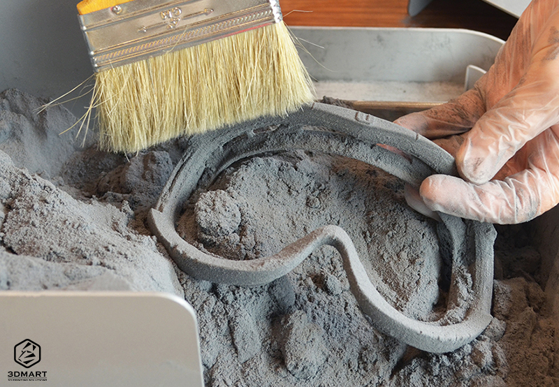 SLS技術使用粉末聚合物作為3D列印的原料,將粉末倒入機器中,機器內部會將薄層粉末來回鋪平在列印範圍,再以雷射光融合材料,並透過微幅的高度升降堆疊並完成印品。由於粉末列印材料會填滿整個內部空間,因此不須使用支撐結構輔助成型(因為整體在列印完成前是緊密的粉末,因此不會有中空材料掉落的問題),未使用完的粉末可以透過專用設備過篩後再與新的粉末混合使用。?