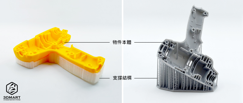 3D列印技術的成形方式需考慮地心引力的影響,想像一下物體在懸空的狀態會往下掉,因此3D列印的材料在成型時若遇到懸空的結構,會需要額外建立輔助材料來生成懸空的主體以避免成型時材料往下掉。這種結構通常稱為支撐材料,根據不同列印形式,使用方式和材料也各有不同。其中,SLS(雷射粉末燒結)技術通常無需這種支撐結構,這會在下方進行說明。