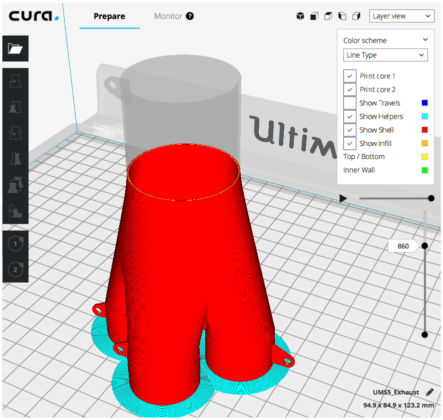【3D列印機】 Ultimaker S5 基本操作介紹! 一、觸控螢幕 二、材料 三、使用Cura 四、開始列印 五、取出列印物件 六、移除支撐材料 七、更換線材與噴嘴 八、列印平臺校正 九、XY偏移校正 十、升降開關校正 一、觸控螢幕 您可以使用列印機前的觸控螢幕來控制Ultimaker S5。 第一次打開Ultimaker S5時,列印機將開始設定導覽。 之後,開啟列印機時將顯示主選單。 介面 主選單提供三個選項,由下方的圖示表現: 狀態概述 狀態概述會自動顯示在主選單旁邊。 從這裡您可以用USB開始列印,或在列印時查看列印進度。 設置概述 設置概述顯示列印機的目前設定。 在這裡您可以查看安裝哪些列印噴嘴、材料和列印平臺,並讓您更改設定。 主選單概述 主選單概述包含三個子選單:設定,維護和網路。 在列印機設定選單中,您可以更改一般設定,例如語言。 在維護選單中,除了儲存維修紀錄之外,還可以執行最重要的維護和校正過程。 網路選單讓您可以更改網路設定或執行Wi-Fi設定。 二、材料 材料相容性 Ultimaker S5配有兩個AA列印噴嘴和一個BB列印噴嘴。 AA列印噴嘴可用於列印建造材料和分離支撐材料。 BB列印噴嘴可用於水溶性支撐材料(PVA)。 Ultimaker S5支援目前所有的Ultimaker材料,其中大多數可以使用所有列印噴嘴的尺寸(0.25,0.4和0.8毫米)進行印刷。以下概述顯示哪種材料與哪種列印噴嘴尺寸相容。 此相容性表格是針對單一擠出列印。 有關可能的雙擠出材料組合搭配,請參考下表。 儘管Ultimaker S5具有開放性材料系統,但建議在列印機上使用Ultimaker材料。所有Ultimaker材料都經過了廣泛測試,並在Ultimaker Cura中進行優化,以確保最佳的列印效果。因此建議在Ultimaker Cura中使用預設配置檔案中的一個,以獲得最高的可靠性。使用Ultimaker材料還可以讓您從NFC檢測系統中受益。 Ultimaker S5會自動識別Ultimaker線材,當連接到網路時,此訊息可以直接傳到Ultimaker Cura,達成列印機與Ultimaker Cura軟體間的無縫連接。 列印建議 每種材料需要不同的設定以獲得最佳效果,如果您使用Ultimaker Cura準備您的模型,如果選擇了正確的噴嘴,材料和列印平臺類型,這些設定會自動選擇正確設定。確認使用最新版本的Ultimaker Cura作為最新的列印配置檔案。 對於Ultimaker S5上支援的所有材料,您必須使用玻璃或鋁製列印平臺進行黏著。 如果您是使用玻璃列印平臺,建議在開始列印前,在玻璃列印平臺上塗上一層薄薄的膠水(使用配件盒中的口紅膠)或黏著板。確保您的列印物件可靠地黏著在列印平臺上,並且可以防止玻璃列印平臺在移除材料時發生的碎裂。 ?貼心提醒:更換列印平臺時,需要更改列印機上的列印平臺設定。 有關每種材料使用哪種設定和附著方法的詳細說明,請閱讀材料比較指南文章。 三、使用cura 準備與Ultimaker Cura列印 介面 在Ultimaker Cura中添加Ultimaker S5後,可以看見主要介面。這裡是介面的概覽。 1.開啟檔案 2.調整工具 3.不可列印的區域 4.3D模型 5.導覽模式 6.列印機、材料、列印噴嘴和列印平臺設定 7.列印設定(建議模式) 8.模型資訊 9.列印作業資訊(列印時間和材料使用情形) 10.藉由網路列印,或儲存至檔案、或USB隨身碟 切片模型 在Ultimaker Cura中切片模型: 1.通過點擊開啟檔案圖示載入模型。 2.在側欄(螢幕右側),檢查材料,列印噴嘴和列印平臺是否正確。 3.使用調整工具定位,縮放和旋轉模型。 4.在列印設定下選擇所需的設定(層厚/列印速度,填充,支撐和列印平臺黏著度)。 5.要查看選擇設定的結果,請將查看模式從實體視圖更改為圖層視圖。 6.在右下角,選擇藉由網路列印,儲存檔案或儲存到USB,具體取決於列印方式。 ?貼心提醒:使用支撐列印時,可以選擇擠出機要用哪種支撐結構列印。讓您可以在Ultimaker S5上使用PVA支撐, 分離支撐或構建材料支撐來列印模型。 ?貼心提醒:如果建立雙色列印,必須指定模型的材質顏色,並在完成切片前合併模型。 關於如何使用Ultimaker Cura的更多說明,請看Ultimaker Cura的教學文章。 四、開始列印 使用Cura Connect開始列印 Ultimaker S5可以通過Wi-Fi或網路上進行列印。當您的Ultimaker S5和電腦連接到同一網路時,可以使用Ultimaker Cura中的Cura Connect來完成此操作。 通過Cura Connect開始列?。?br /> 1.通過Wi-Fi或網路將您的Ultimaker S5連接到網路(若尚未完成): 2.在網路選單中開啟Wi-Fi或網路。 3.在Ultimaker Cura中,進入設定>列印機>管理列印機。 4.點擊藉由網路連接的按鈕。 5.從顯示的列印機列表中選擇您的Ultimaker,然後點擊連接。這臺列印機現在是群組主機。 6.在Ultimaker Cura中切片您的3D模型。 7.點擊透過網路列印 開始列印。 ?貼心提醒:一旦列印開始,您可以通過開啟Ultimaker Cura螢幕頂端的監視器選項卡或使用Ultimaker app來監控它。 這使您可以查看列印的進度並在遠處控制您的Ultimaker S5。 ?貼心提醒:傳送多個列印作業時,Cura Connect會自動將它們增加到列印對列中。 查看Cura Connect手冊查看更詳細的功能說明。 用USB列印 當無法通過網路列印時,3D列印檔案仍然可以通過USB傳送到您的Ultimaker S5。 1.將USB插入電腦。 2.在Ultimaker Cura中切片您的3D模型。 確保Ultimaker Cura中的材料、列印噴嘴和列印平臺設定與您的Ultimaker S5上的設置相符。 3.按下儲存到移動式儲存裝置按鈕將列印檔案儲存到USB(GCODE,GCODE.gz或UFP)。 4.再Ultimaker Cura移除USB並將USB從電腦中取出。 5.將USB放進Ultimaker S5的USB插槽中